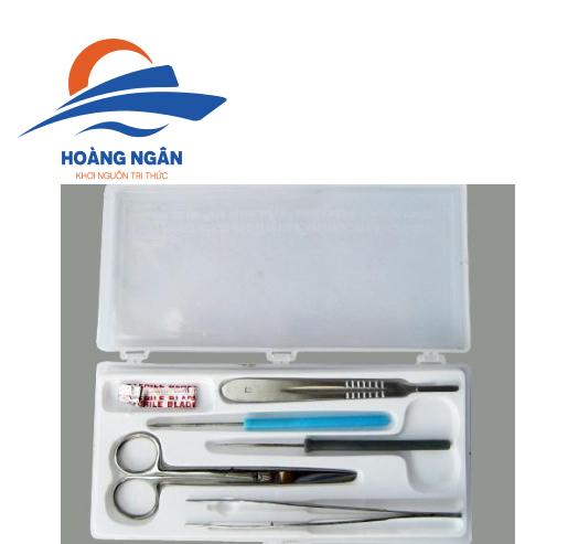 Gồm 1 kéo to, 1 kéo nhỏ, 1 bộ dao mổ, 1 panh, 1 dùi, 1 mũi mác (tất cả được đựng trong hộp).